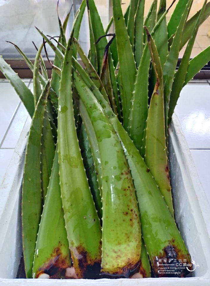 採新鮮的蘆薈➞泡水讓大黃素流出➞削皮➞取蘆薈果肉➞榨汁(#不加ㄧ滴水)➞結冰➞ 製做蘆薈皂。